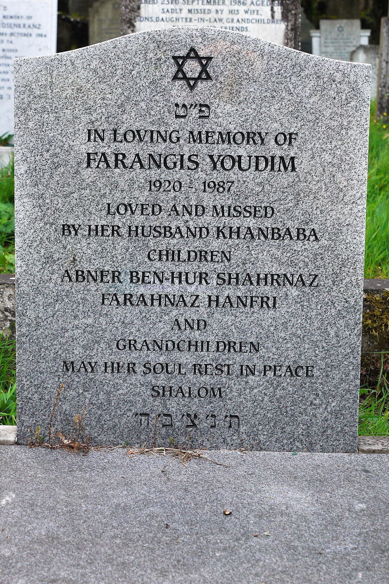 Additional Information: Youdim, Mrs, LOVED AND MISSED BY HER HUSBAND KHANBABA CHILDREN ABNER BEN HUR SHAHRNAZ FARAHNAZ MANFRI AND GRANDCHILDREN