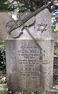 The fate of Stryj is well documented in “The Book of Stryj”, written by the surviving residents of Stryj in Israel, 1962. In it there is a description of the events that lasted from July 1941 to August 1943, when the Stryj ghetto and labour camps were liquidated. Stryj was liberated by the Red Army on August 8th, 1944. Several Jews emerged from hiding but it is not know whether Samuel was among them. A Dr. N. Becher is listed as having died during the pogroms in Stryj – could he be a relative?The sculpture of the violin on the stone is extraordinary: not only is it beautifully made, but is it very unusual to find an ornament like this on a stone – there must have been a great deal of discussion between the stonemason and the burial board!How and when Samuel left Stryj and his route to England, are unknown. His next record is when he gained British Naturalisation in May 1952 whilst living in High Wycombe. In the 1965 Probate Register, he is described as a Polish musician who lived at an address in Winton, and probate was granted to Alice Laura Giovanna Clinkard. She is likely the ‘Alice’ on the stone, and she paid for its styling and erection.
